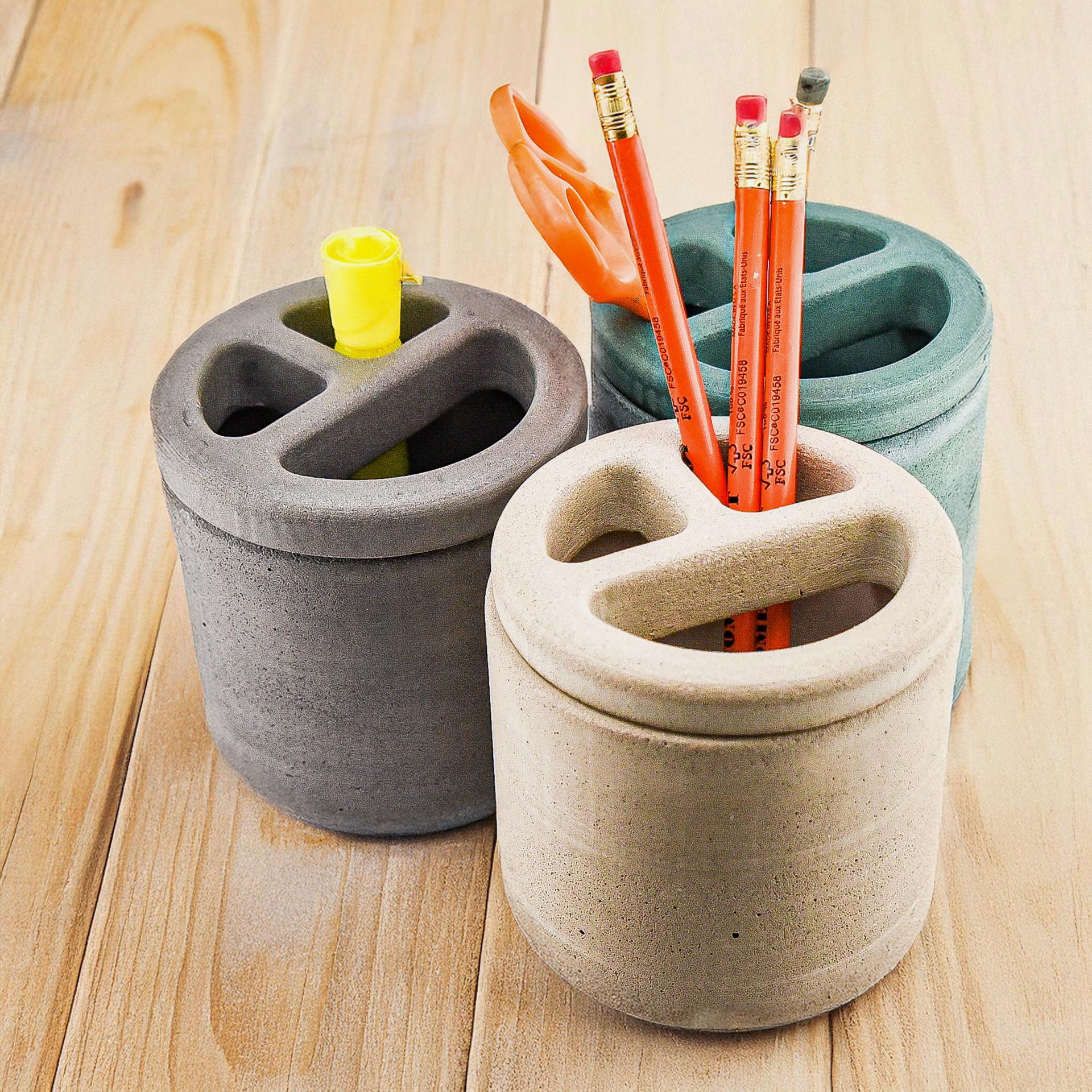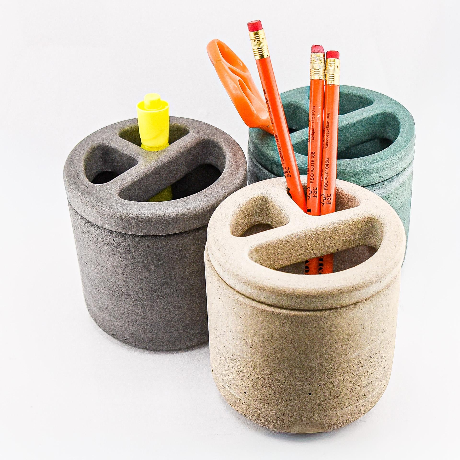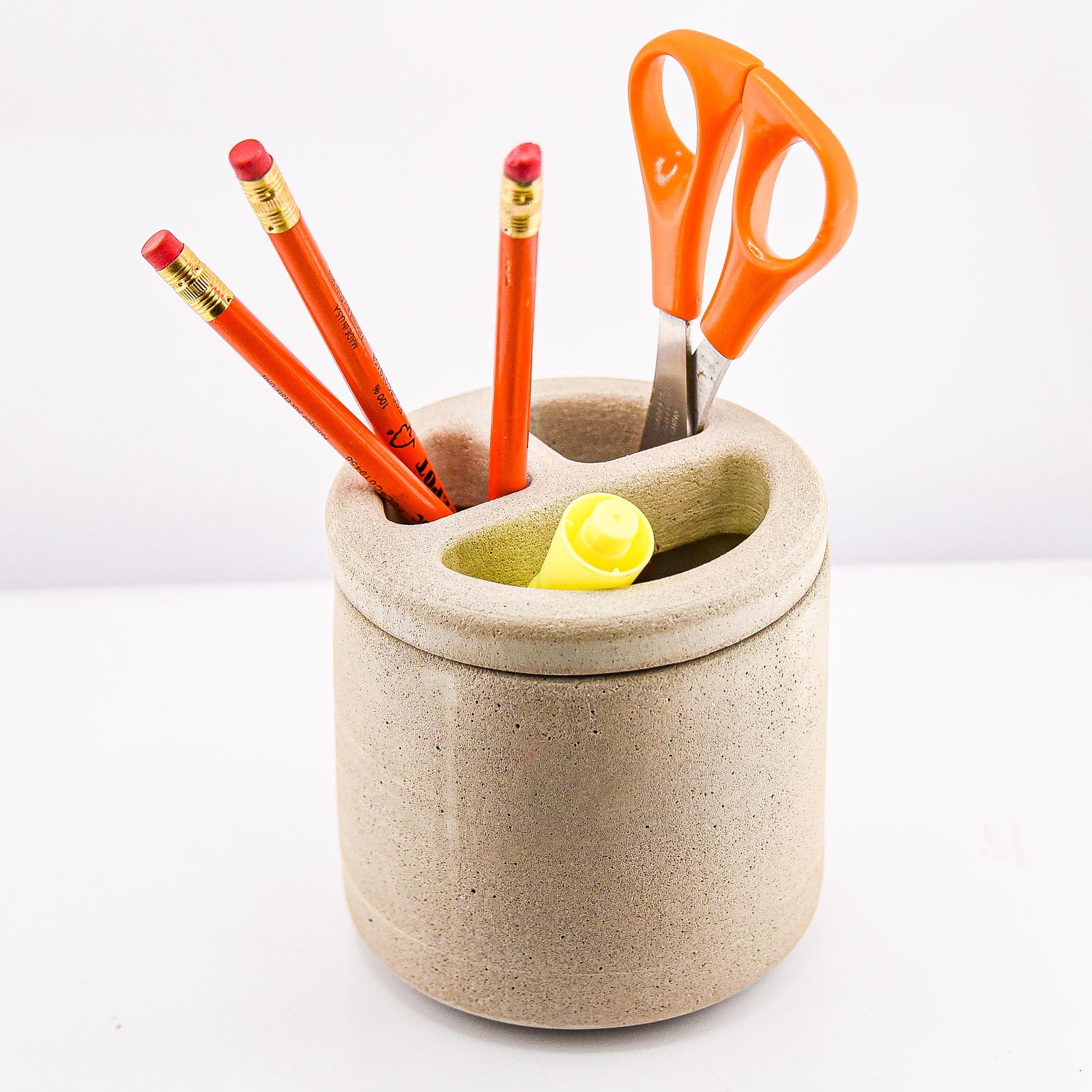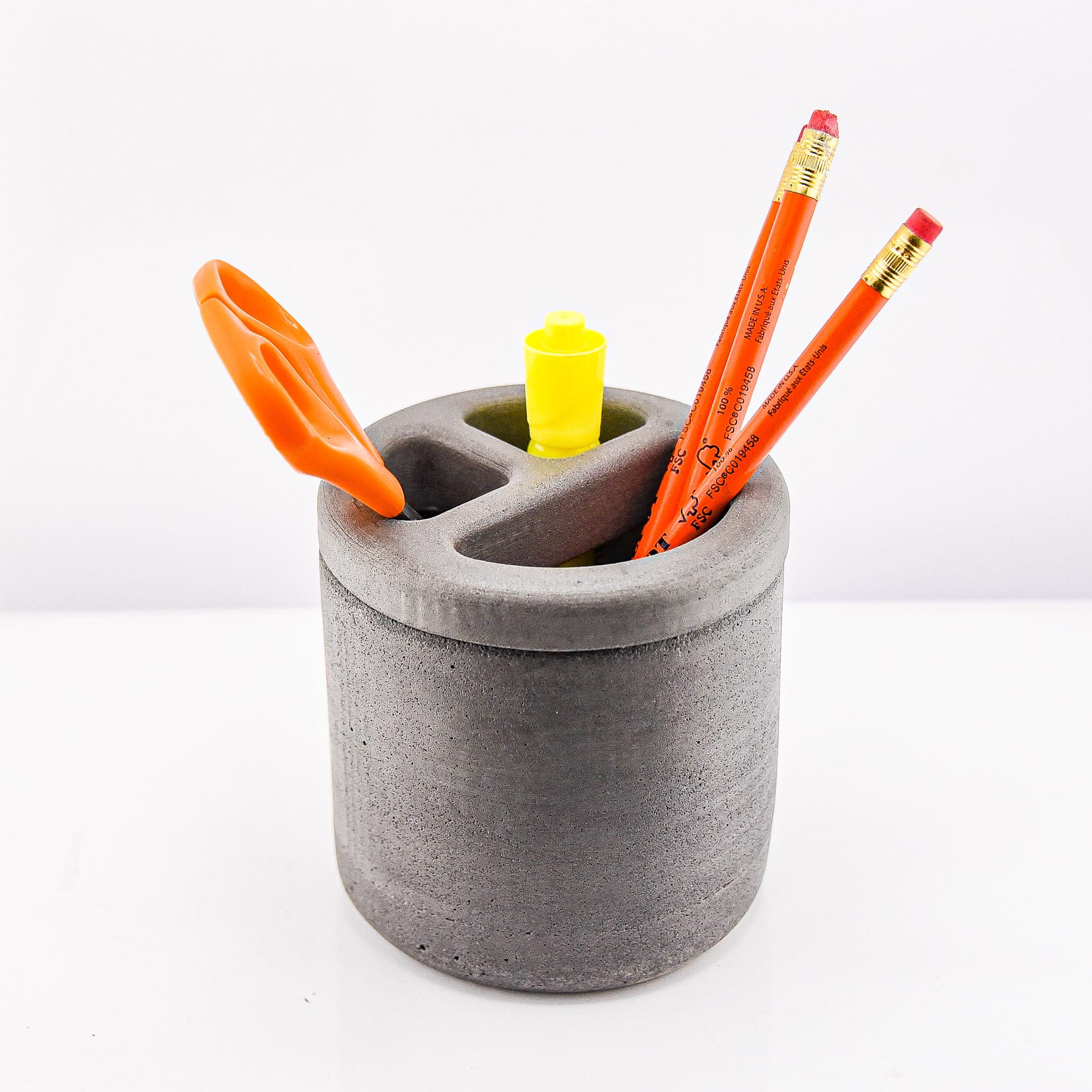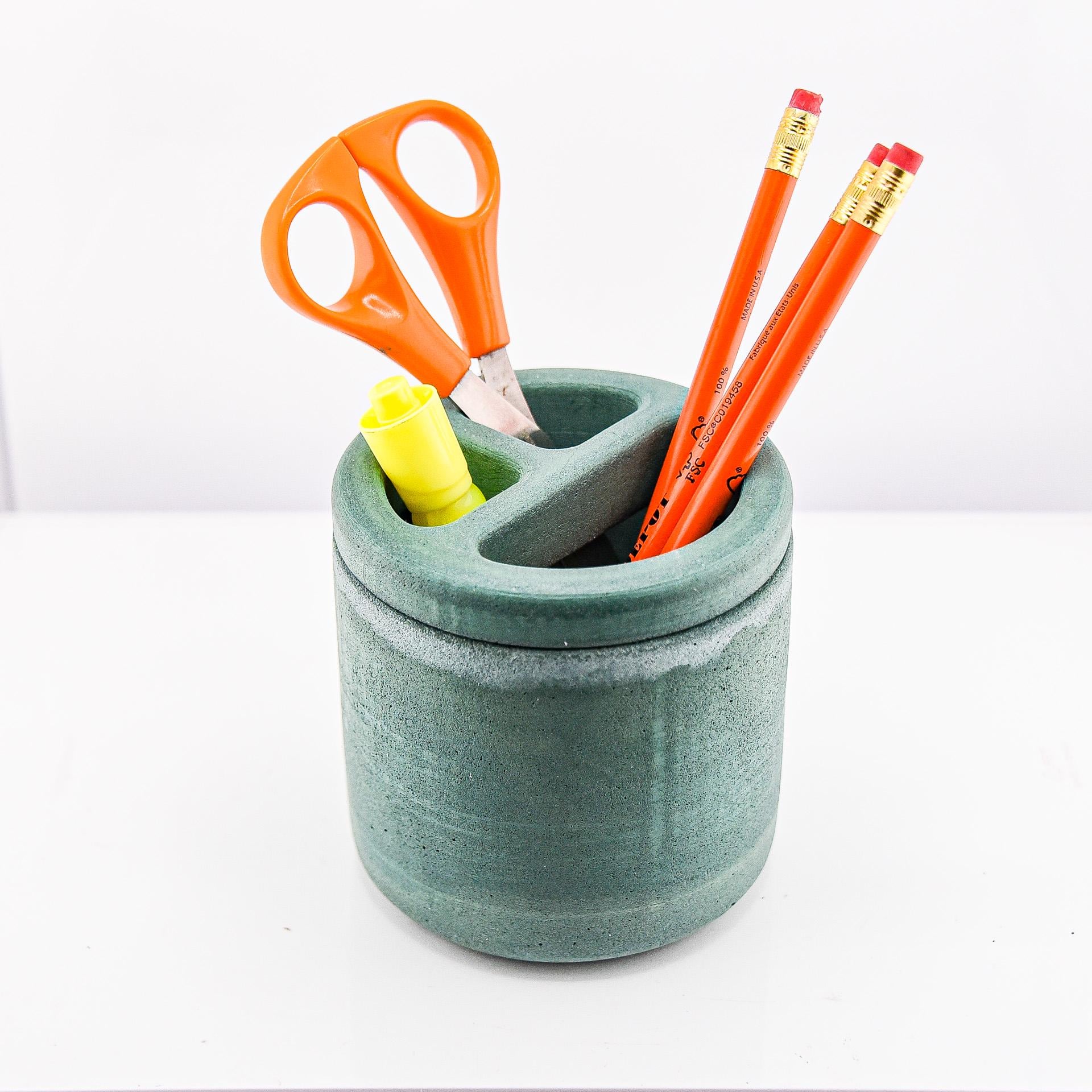 Details: Handmade from solid concrete Approx. 4” tall Removable lid with divided openings Available in neutral, black, or green Ideal for pens, pencils, scissors, or small office supplies Minimalist, modern design Heavy and stable for everyday use