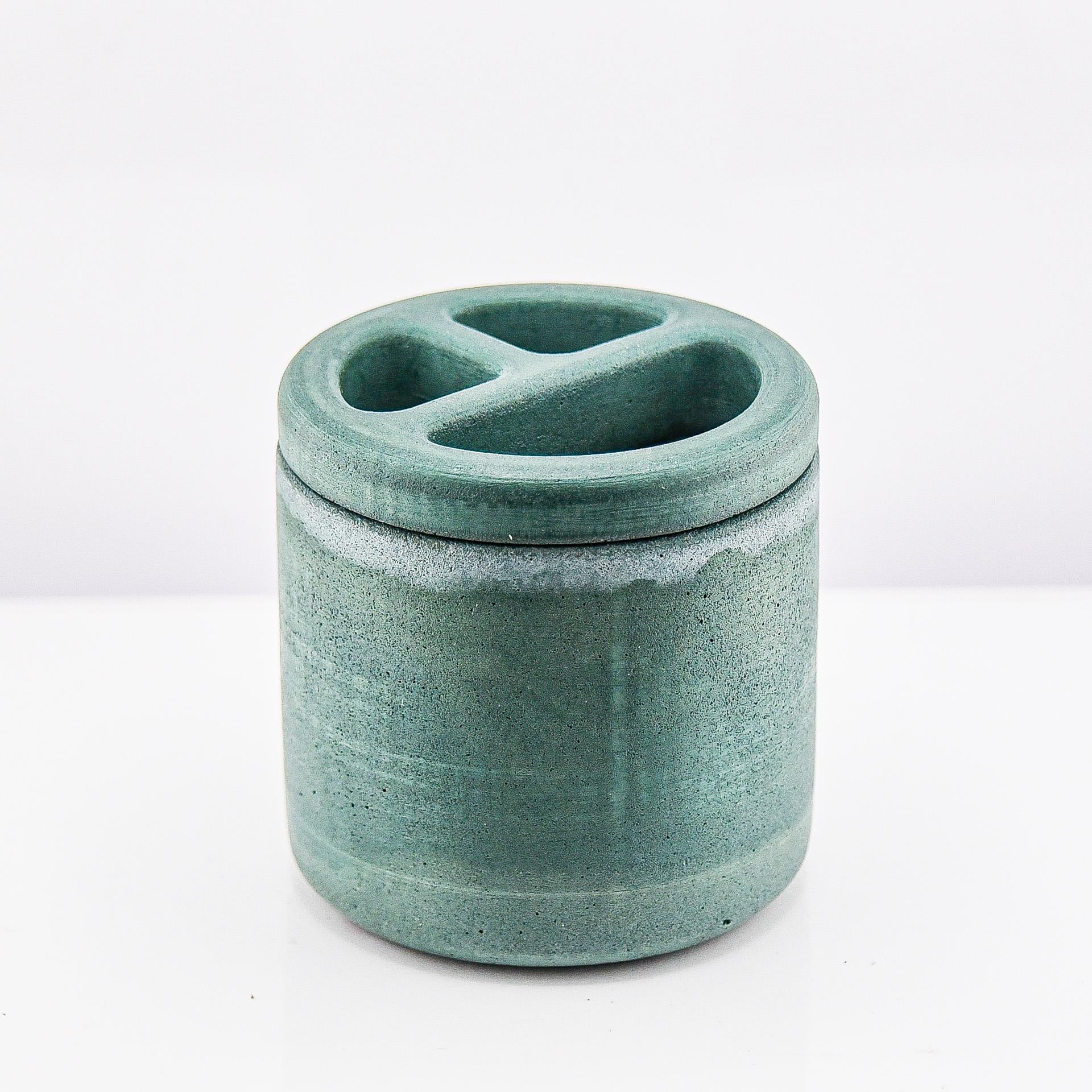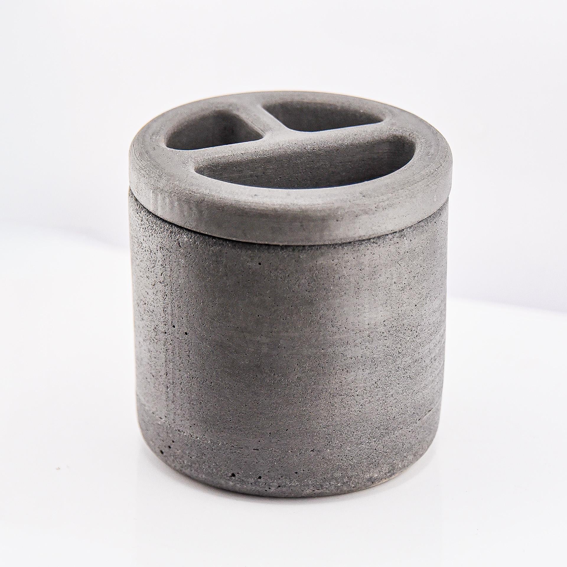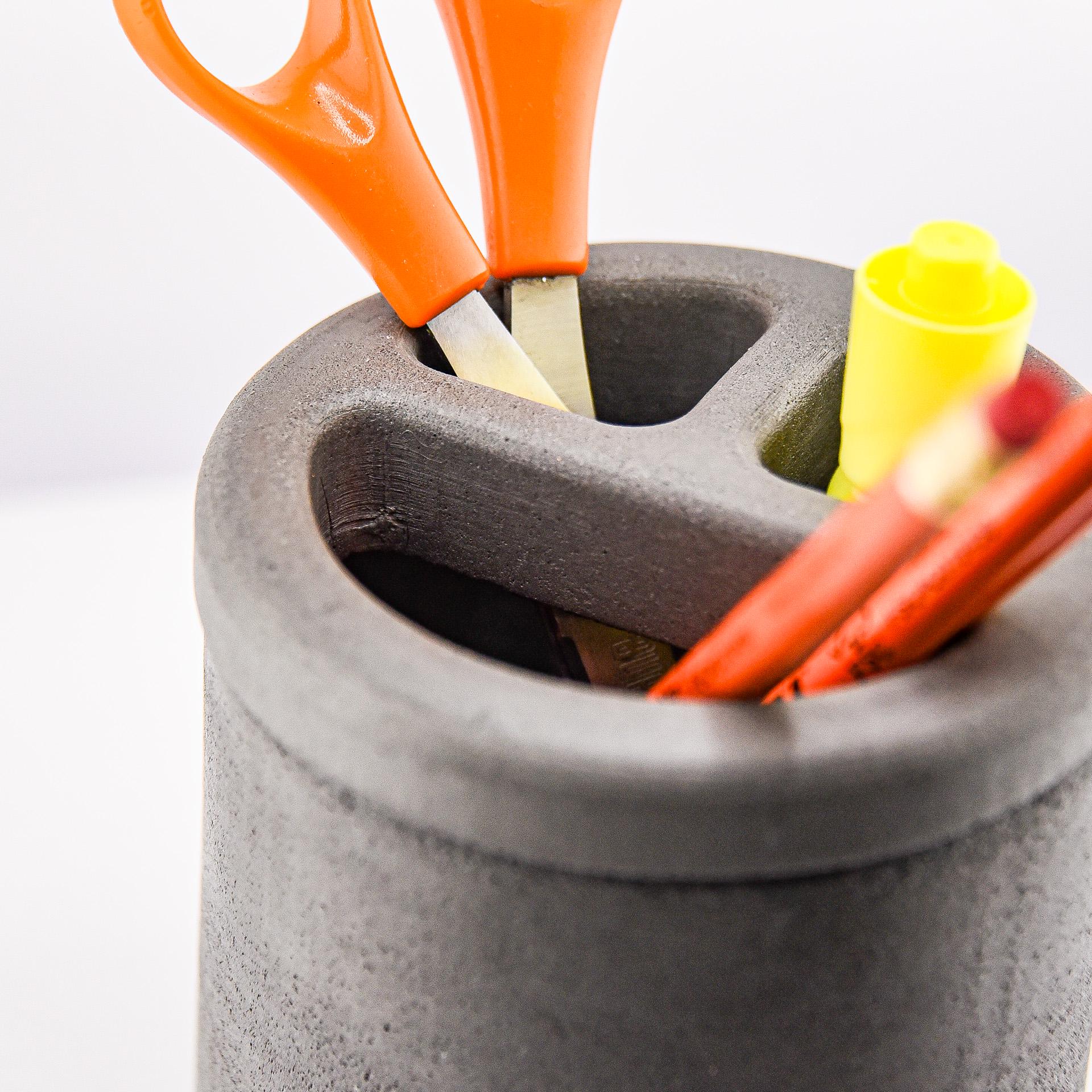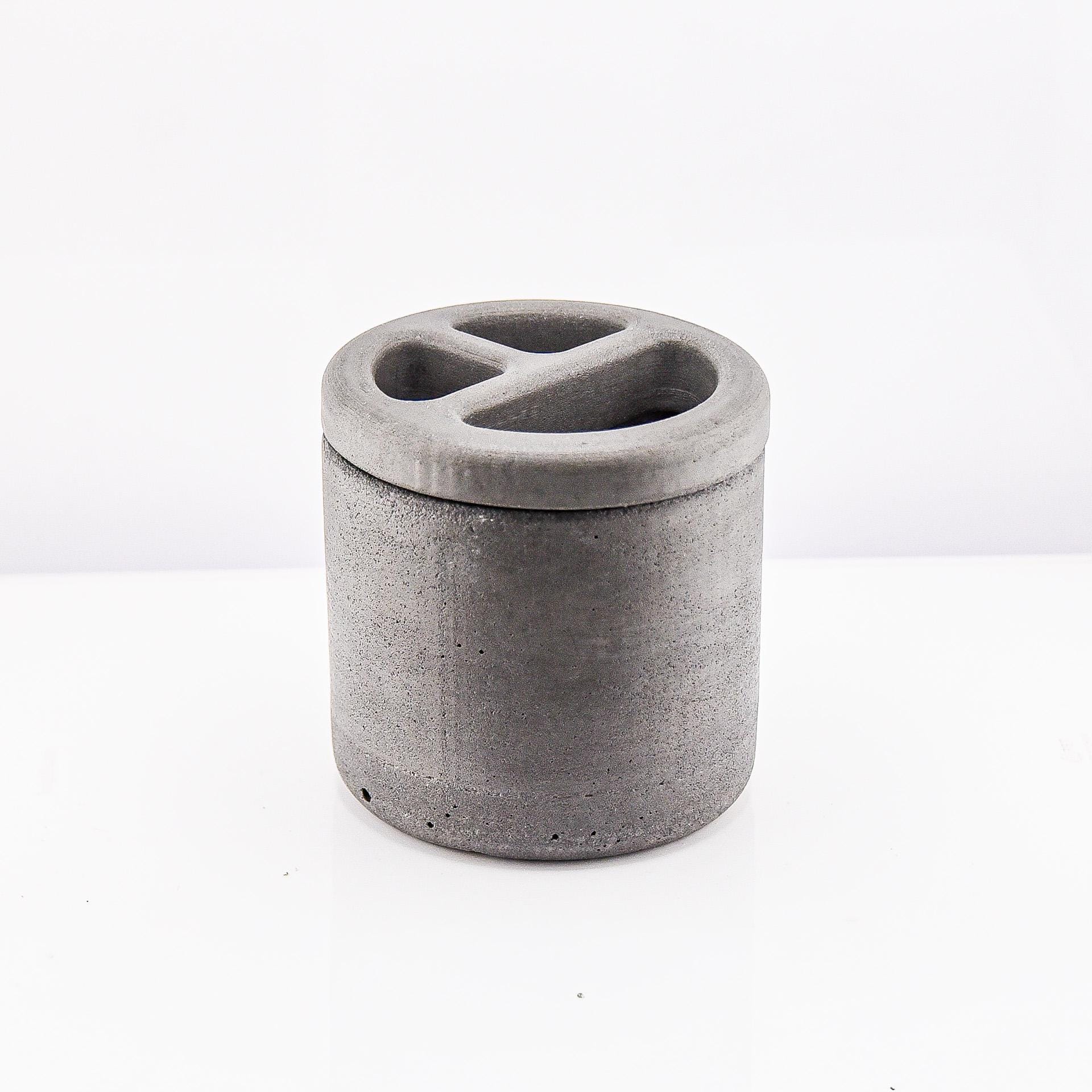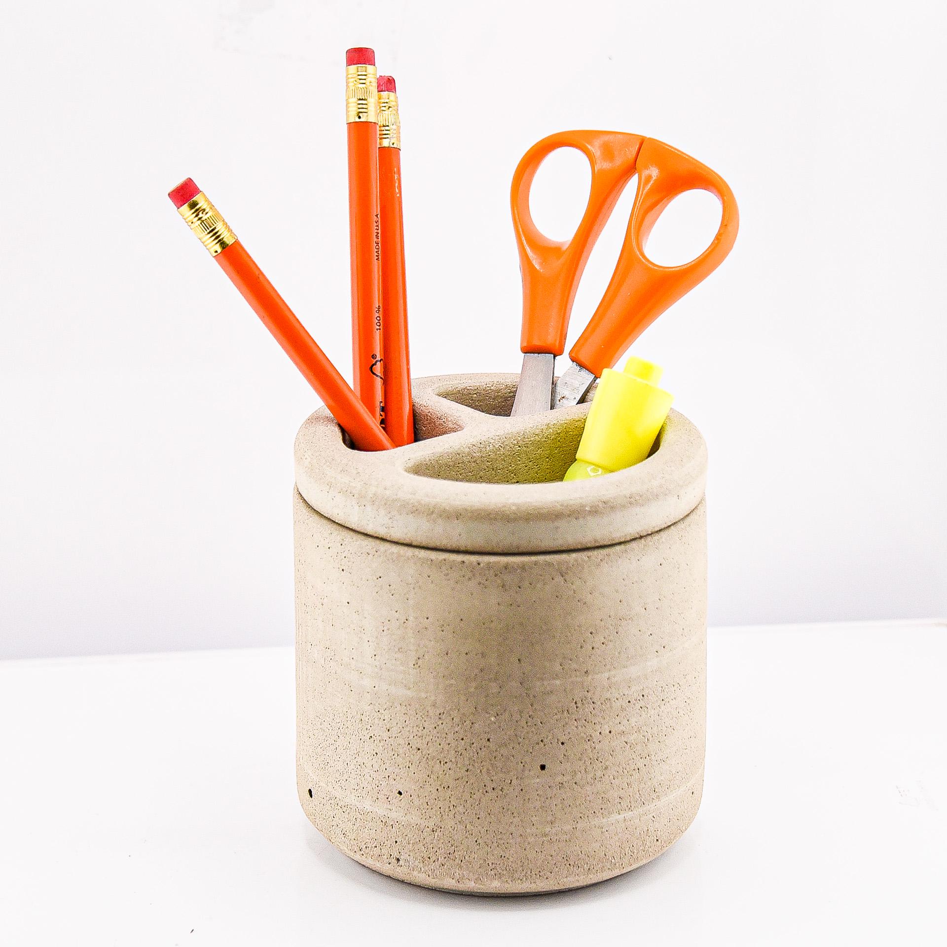 Details: Handmade from solid concrete Approx. 4” tall Removable lid with divided openings Available in neutral, black, or green Ideal for pens, pencils, scissors, or small office supplies Minimalist, modern design Heavy and stable for everyday use