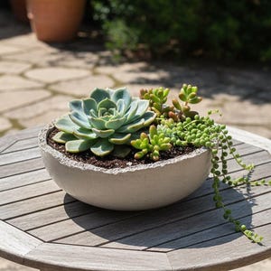Details: Outside Dimensions: 6" diameter × 5" height Inside Dimensions: 4" diameter × 3.5" depth Weight: 6 lbs Integrated drainage tray Sealed for moisture resistance and easy cleaning For indoor or covered outdoor use Each piece is one-of-a-kind with natural concrete variations A striking gift idea for design lovers, plant parents, or anyone who appreciates handmade decor with personality. Makes a perfect gift for her or gift for him.